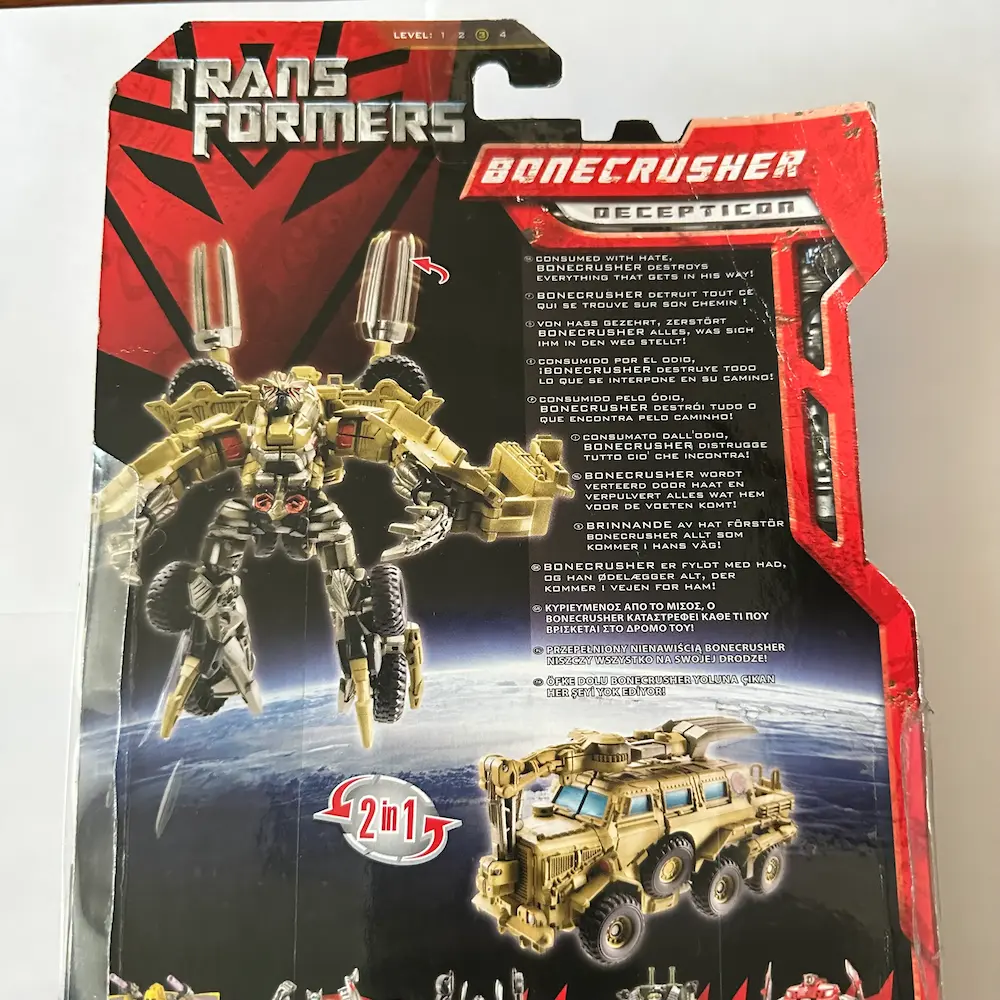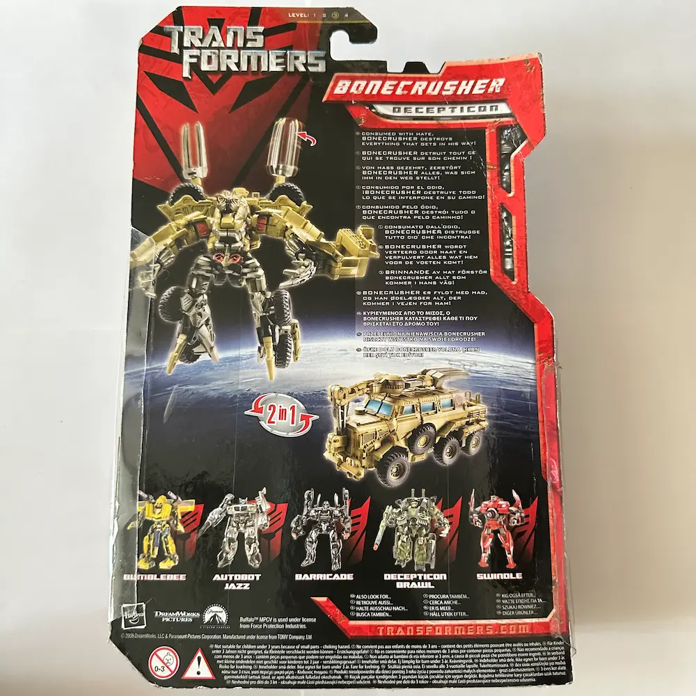 Transformers Movie Mainline Bonecrusher figürü ile Transformers mainline koleksiyonunuzu tamamlayın. İlk film oyuncakları arasında en beğenilen figürler arasında olup tank tasarımıyla ön plana çıkmaktadır. Koleksiyon değer yüksek bir figürdür. Robot modundan zırhlı yıkım aracı moduna dönüşmektedir. Tasarım açısından çok detaylı parçaları bulunmakla birlikte dönüşüm aşamaları çok keyiflidir. Sergilemesi çok güzel bir figürdür.